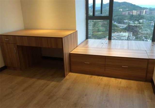 這是其中的一間臥室,我們把飄窗直接打掉了,然后利用凸出去的部分做了一個榻榻米,榻榻米的面積不大。但是平時在這上面休閑活動還是夠用了。同時還能增加一點房間的收納能力。加上旁邊的書桌,這樣一個房間的基本功能就實現(xiàn)了。