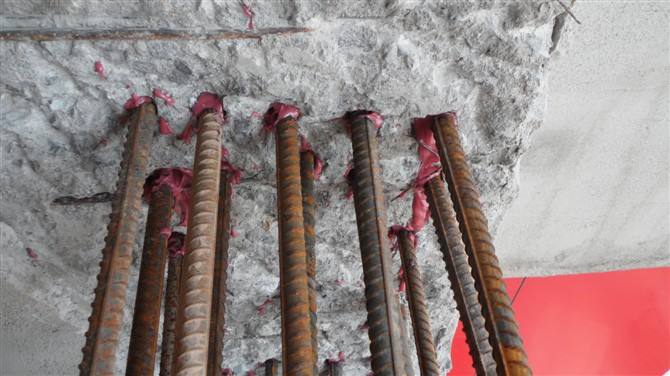 按設計要求的位置、寬度和高度,對梁側面、頂面及板面進行砼鑿面,要求鑿面輕錘、鑿毛,并去掉松散顆粒,且鑿面要用鋼絲刷凈,高壓水沖清洗干凈;以有利于新舊砼能夠可靠的連結,保證新舊結構的整體性和良好的抗震性。