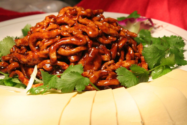 5.將炒好的肉絲碼在盤上,撒上蔥絲即可。