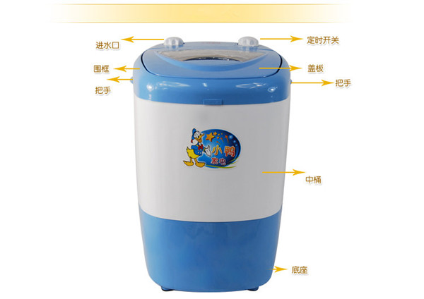 小鴨迷你洗衣機由左邊洗衣桶和右邊脫水桶二個部分組成,在控制面板上有三個旋鈕,依次是洗衣定時器,排水選擇開關,甩干定時器。