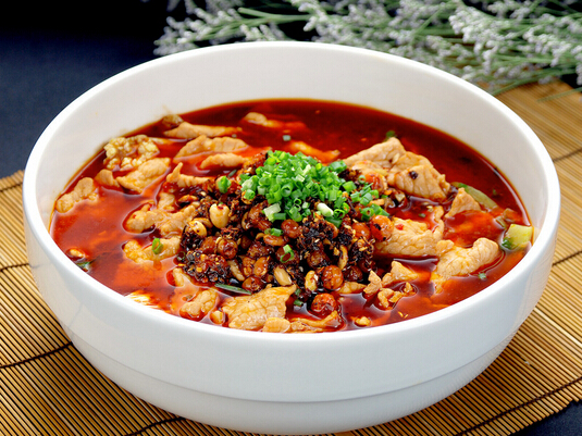 5、調好紅湯后加入腌制的肉片,然后用筷子滑散。中火燒至微開后立即關火將肉片撈到大碗中,加入紅湯,撒上花椒,蒜末辣椒面與芝麻后,澆上約4大勺量的熱油即可。