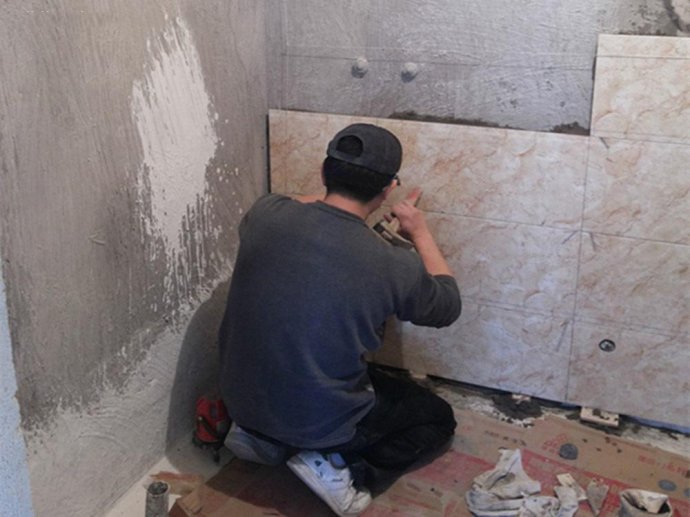 在水泥的上面貼瓷磚、鋪地板看起來很容易,但做起來就很難,因為必須要把每一塊瓷磚貼的平平整整的,如果凹凹凸凸不但影響美觀,而且會被絆倒,所以說,平整度就是泥瓦工程的另一個難點,工人們必須要用標尺一點點地測量標準的高度。