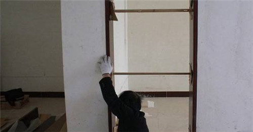 門框在購(gòu)買到貨時(shí),都是散件,需要我們組裝。門頂板一般來(lái)說(shuō)會(huì)比門洞長(zhǎng)20-50mm,門縫則在6-8mm。固定門框,然后門框左右上拉片,就可以把門框?qū)?zhǔn)門洞放入,然后再在頂板中間釘兩拉片。