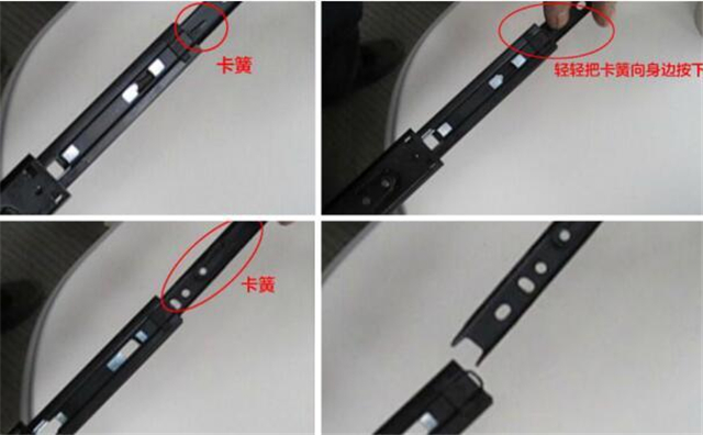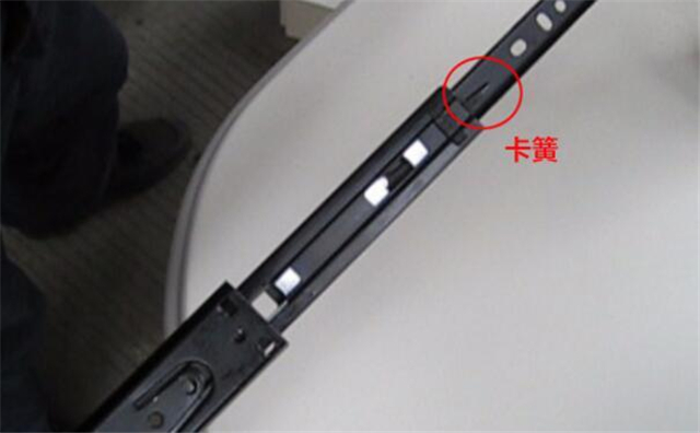 抽屜滑軌安裝前需要將所有的抽屜滑軌的內軌拆卸下來(ps:外軌跟中軌直接不用拆卸),拆卸方法如圖所指,按下圖內圈起來的卡簧,輕輕將抽屜內軌的卡簧往身體方向扣下,然后抽出內軌,注意拆卸內軌小心不要弄到導軌變形。