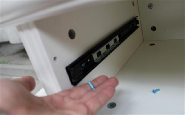 然后將抽屜滑軌內軌用電動螺絲鉆安裝在抽屜外側,注意在抽屜內軌在有調整抽屜前后調整孔位的備用孔,安裝位置可以通過這些孔位調整抽屜的前后位置。