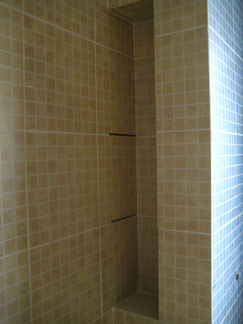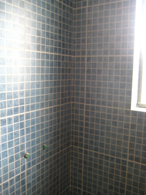 衛生間的瓷磚已經鋪好了。在貼瓷磚的施工當中,陰陽角的拼接要求是很高的,處理的不好很容易讓瓷磚邊角損壞。