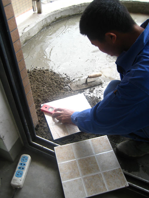 我們進門時工人師傅正要開始鋪地磚。他告訴我們做地磚前,地磚基層要用一比一的水泥黃沙掃漿,這樣可以防止原地面內的污垢、油泥等滲到外面,造成基層空鼓。