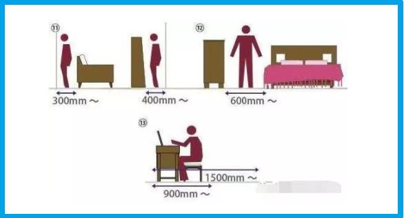 過人的通道寬度不能低于300mm,床和衣柜之間的距離保持在600mm,梳妝臺預留900mm的空間。