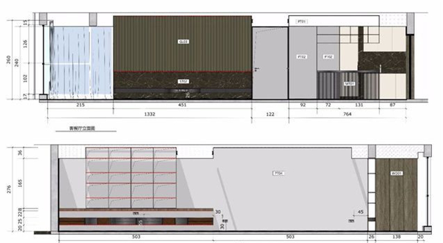 立面圖相比平面圖要容易看許多,立面圖是反映居室墻面造型的圖片。由于立面圖的視角和我們平時看墻面的視角是一致的,因此非常容易看懂。比如,上圖中的圖片就是一套別墅的客餐廳兩面墻的立面圖。其中圖片的上半部分是電視背景墻所屬墻面的立面圖,下半部分是沙發背景墻所屬墻面的立面圖。這里看立面圖的時候需要提醒一下,不要把墻看錯就行了,比如把電視背景墻的立面圖看成沙發背景墻的立面圖,如果我們不會看錯,那么看立面圖就不會出太大的問題了。