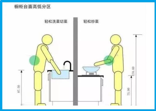 烹飪區主要有煙機灶具,我們需要考慮到炒菜時炒鍋的高度,所以 烹飪區的臺面高度要低于清洗區,這樣胳膊不用抬太高。
