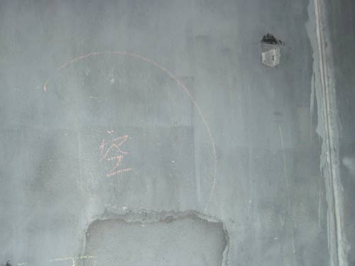 墻上的標注說明了有前期監(jiān)理對房屋進行"體檢",發(fā)現(xiàn)空鼓立即標注。