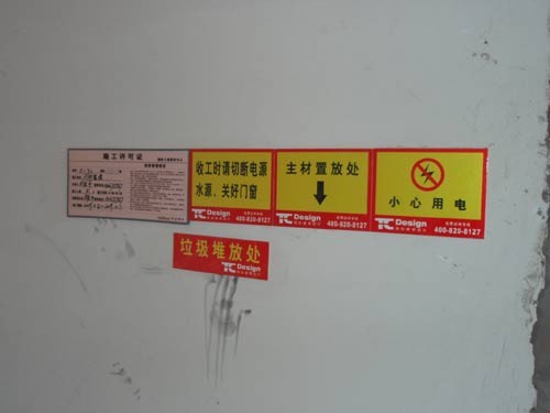 材料堆放處等警示牌和告示。施工服務(wù)銘牌上明示著設(shè)計師、質(zhì)驗員、施工工人的身份和照片,還有公司和監(jiān)督電話,方便業(yè)主隨時監(jiān)督。