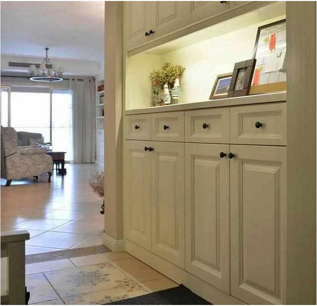 入戶門(mén)廳裝了個(gè)頂天立地的大鞋柜,容量絕對(duì)夠用,這樣家里人的鞋子全部都能放得下了,再也不會(huì)門(mén)口堆一堆,床底下塞一片了。白色的定制鞋柜看起來(lái)也是非常的大氣。