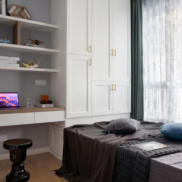 次臥的空間打造成榻榻米,由于臥室的空間實(shí)在是太小了,所以做成榻榻米的設(shè)計(jì),靠墻打造的是白色柜子和可以儲(chǔ)物的床鋪,以及一體式的書桌書架,這樣的結(jié)構(gòu)設(shè)計(jì)節(jié)省空間,讓小臥室變得更加的寬敞。