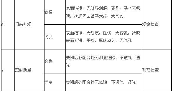 (5)鋁合金門窗安裝后外觀質(zhì)量應(yīng)表面潔凈,大面無劃痕、碰傷、銹蝕,涂膜大面平整光滑、厚度均勻、無氣孔。