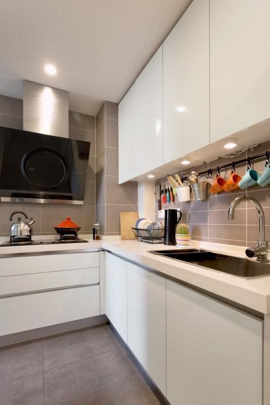 廚房設計成一個l型的一體式櫥柜,空間還是很大,原始結構設置的灶具的位置,是圖面上水槽的位置,為了增加廚房的收納空間,把灶具移走,這邊放水槽,水槽上方一整年吊柜。原本就3米多的櫥柜,增加了吊柜,完全滿足了儲藏需求。