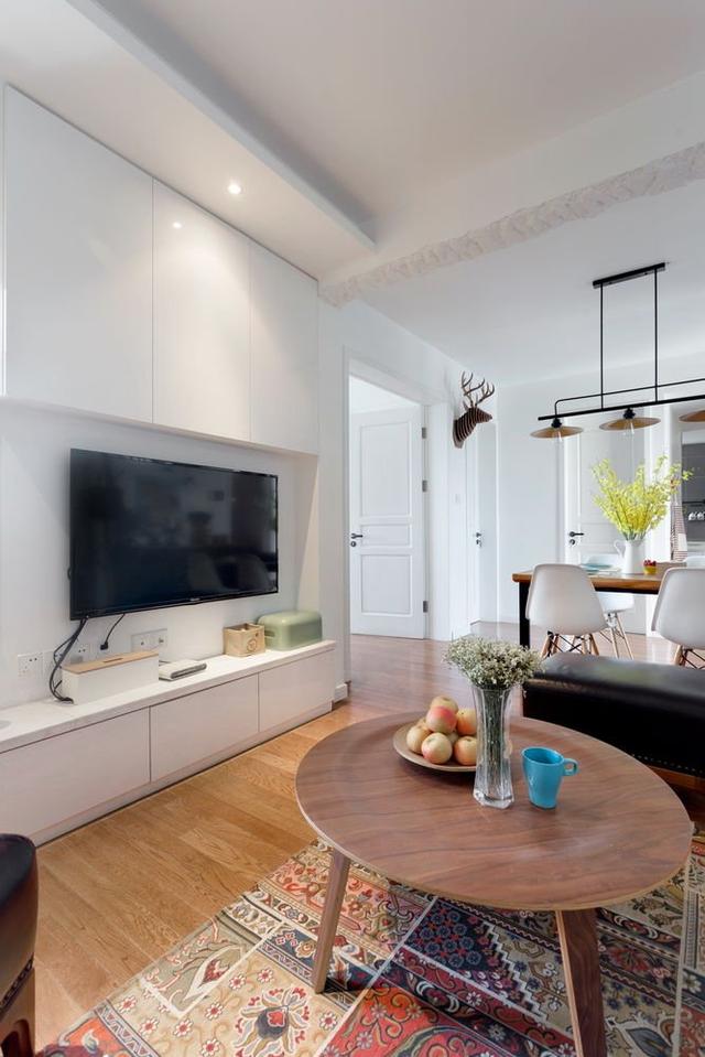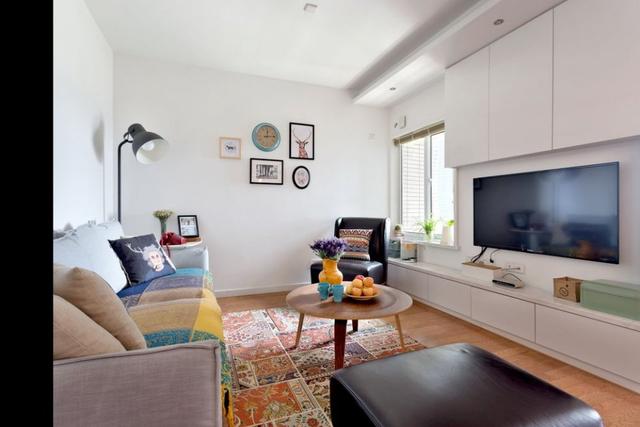 次臥的空間還是挺大的,一個小小的客廳,但是卻很溫馨,舒適,沒有做不必要的所謂的設計造型,電視下的儲物柜一整排,很是實用,