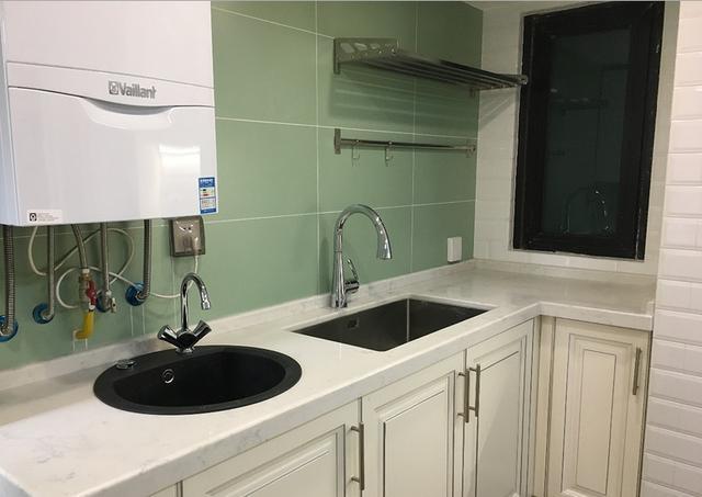 廚房墻磚采用馬卡龍色墻磚,水槽上方也想過用面包磚,不過要安裝東西,不得已才選擇了馬卡龍色大塊瓷磚。