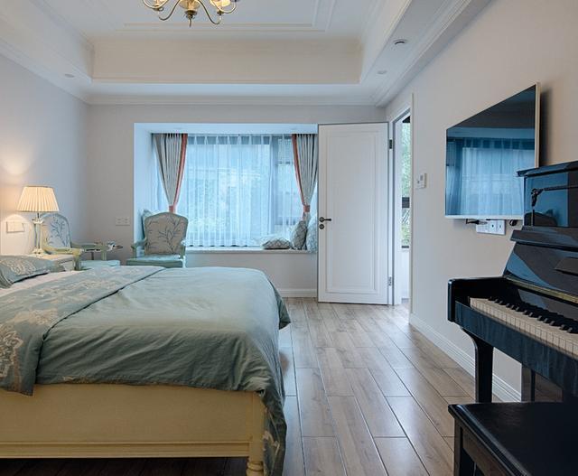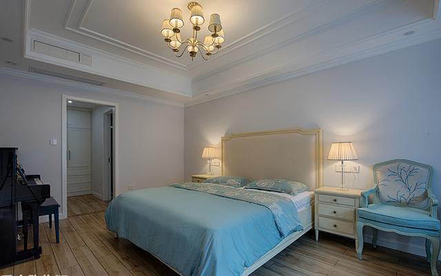 主臥的空間寬敞又舒適,簡約的裝扮特別的溫馨,美式的床頭特別的典雅大氣,采光挺好的,雖然沒有落地窗那么完美,但也不差,亮堂堂的臥室看著心情就好。