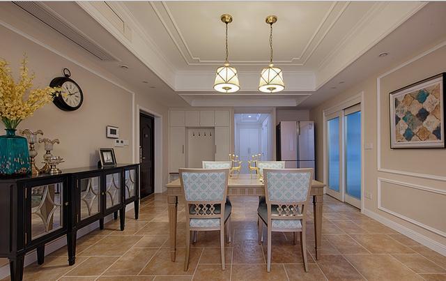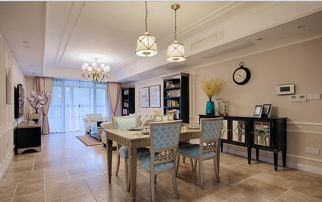 旁邊的餐邊柜也是特別的漂亮,全屋的地板用的是復古磚,古典有氣質,餐廳的吊頂與客廳的是一體式的,這樣整個房屋看起來更加的寬敞。