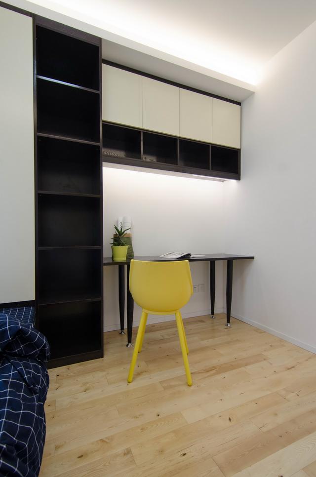 角落是個辦公區,一把亮黃色的椅子提升了空間整體的亮度。