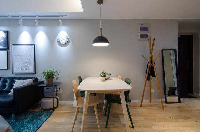 餐桌椅直接擺在客廳旁邊,黑色燈罩的吊燈很具有工業風的格調,沒有過多裝飾物,綠植是最好的軟裝。