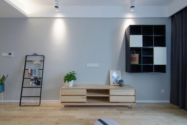 我家整體都刷的是淺灰色的墻漆,電視背景墻沒有裝飾,左邊一個置物架,右邊在墻上打了一個柜子,收納上墻,不占空間,也算是對背景墻的點綴了。
