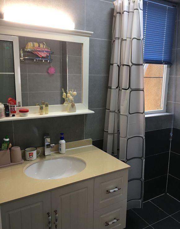 衛生間通鋪灰色瓷磚,耐臟容易打理,空間小只能用浴簾做簡單的干濕分離裝修。