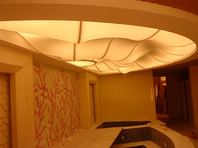 軟膜天花——在十九世紀始創(chuàng)于瑞士,95年引入中國,經(jīng)我國引進。這是一種近年被廣泛使用的室內(nèi)裝飾材料。軟膜需要在實地測量出天花尺寸后,在工廠里制作完成。軟膜尺寸的穩(wěn)定性在攝氏-15度到45度。透光膜天花可配合各種燈光系統(tǒng)(如霓虹燈、熒光燈、LED燈)營造夢幻般、無影的室內(nèi)燈光效果。