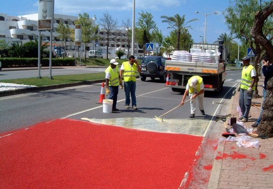先用反光錐或其它警示護欄把需要鋪設的路面圍閉起來,然后使用掃把或路面清潔機把地面上的雜物及其它垃圾清掃干凈,再使用吹風機把地面上的灰塵清理干凈。注意:施工路面不可以有水或帶有潮氣,潮濕的路面會大大的降低黏合劑的對路面的附著力,嚴重影響黏合質量。
