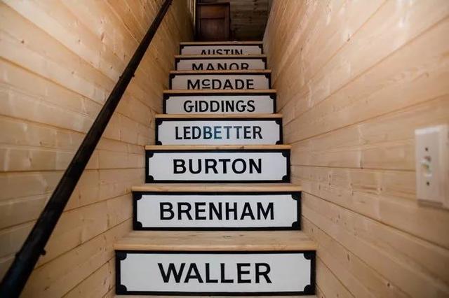 在這個樓梯,將噴繪出來的英文字母或者想要旅游的景點名字加入樓梯,每走一步,每上一臺階,都覺得是“到站”的感覺。另外,樓梯選用的木材材質,營造了濃郁的復古風格。