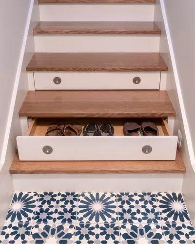 樓梯的每一步階梯下面經常是不被利用的,但它可以成為一個隱藏的存儲雜物的地方。設計師在樓梯的設計中,將樓梯變成了一個隱藏式的鞋柜,這些抽屜可以收納家庭成員的拖鞋,以便在他們進入主要生活空間。