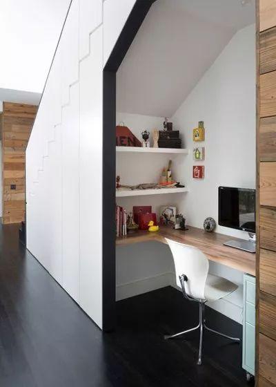 如果您沒有可用于書房的獨立房間,可以考慮在樓梯下的空間設計出一個簡易的書房。一張書桌,一個書柜,一張椅子,足以營造出時尚的工作空間。