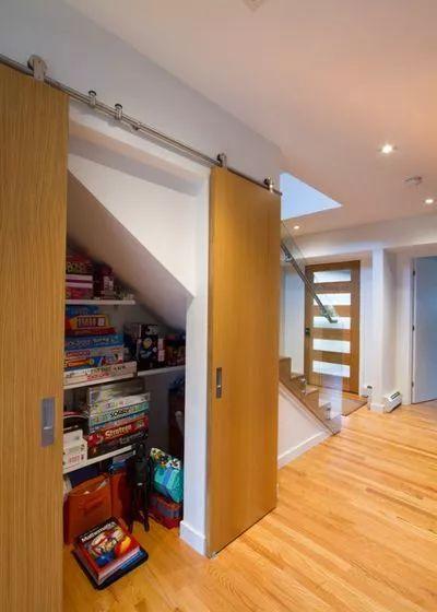 通過用一組滑動谷倉門覆蓋這個三角形凹室,設計師為他們的業主開辟了一個強大的存儲空間,存放著各種玩具和游戲機柜。而采用的木門,以及推拉門的軌道,旨在與房間的的木質元素相匹配,使空間元素更加統一。