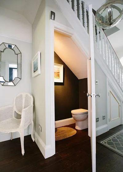 在小小的空間,設計成一個公共衛生間。樓梯下面的空間足以為廁所和洗手盆提供充足的空間。這樣也是提升空間功能性的絕佳方式。