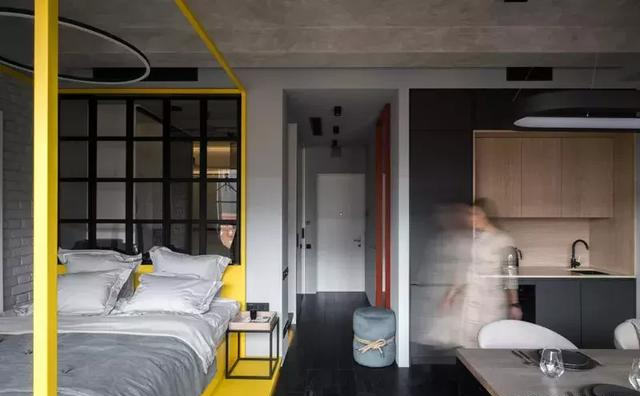 ▲設計師將臥室定義為開放又獨立的趣味空間,無任何隔墻遮擋,與外部相連,這是開放的,同時巧妙地通過灰色的磚塊、檸檬黃的金屬框架、大幅的熊貓藝術品,巧妙的劃分著區(qū)域。