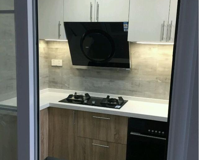 廚房面積不大,設計了L型的櫥柜,拐角處的地方恰好放冰箱,充分利用了所有空間。