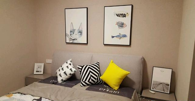 主臥風格和客廳保持一致,淺灰色的雙人大床搭配幾何圖形的床品,床頭上方兩幅卡通畫裝飾墻面。
