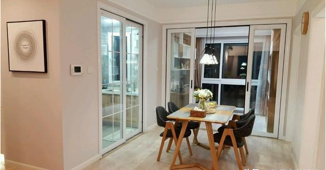 書房和廚房都用玻璃推拉門做隔斷,既做了分隔又能保證餐廳的采光。