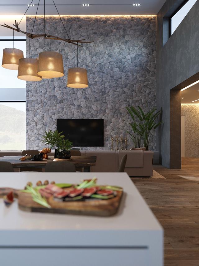 石頭覆蓋的電視墻裝飾延伸到椽子。