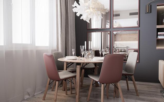 這個(gè)客廳餐廳組合說明了如何使用一個(gè)聲明的顏色在灰色背景下,而不是壓倒它。這種暗粉色傾向于與灰色調(diào)和,而不是相互抵消。