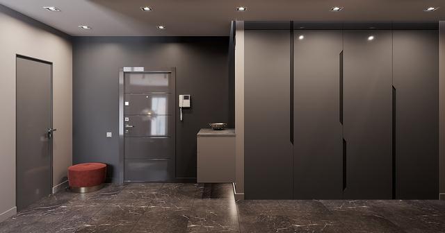 走廊上鋪著灰色大理石地磚,墻上是灰色的壁櫥。