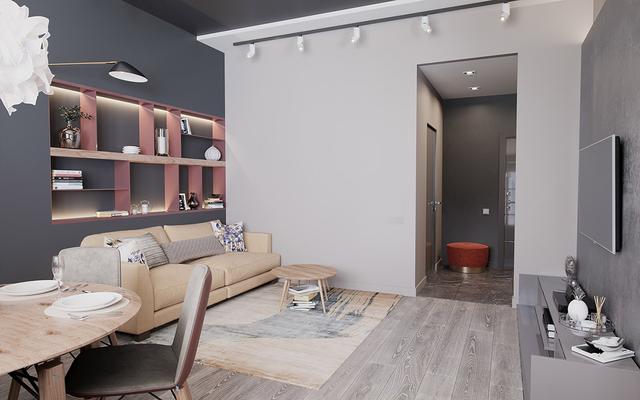原始的混凝土電視墻裝飾有助于平衡粉紅色調(diào)的甜味。墻上安裝的電視下方有一個(gè)灰色的控制臺(tái),與背景融為一體。