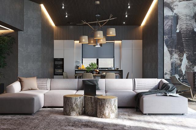 這個(gè)客廳就像一個(gè)舒適的深灰色繭。這是一間開放式的房間,廚房直通餐廳空間和休息區(qū)。盡管房間有多種用途,但由于選擇了一種寧?kù)o的顏色,空間感覺完全平靜和有凝聚力。