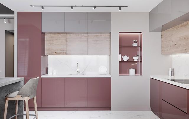 昏暗的粉色底座和木制壁柜構(gòu)成了廚房。L形的廚房還包含一個(gè)混凝土早餐吧臺(tái),將廚房與休息室和正式的用餐區(qū)分隔開來。