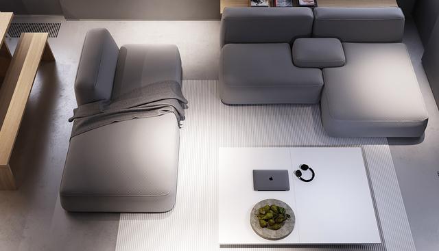 極簡(jiǎn)主義的客廳包含一個(gè)超級(jí)光滑的沙發(fā),讓人想起巨大的灰色鵝卵石。一張紋理微妙的地毯增加了腳下的空間,在一個(gè)低矮的白色咖啡桌下面。