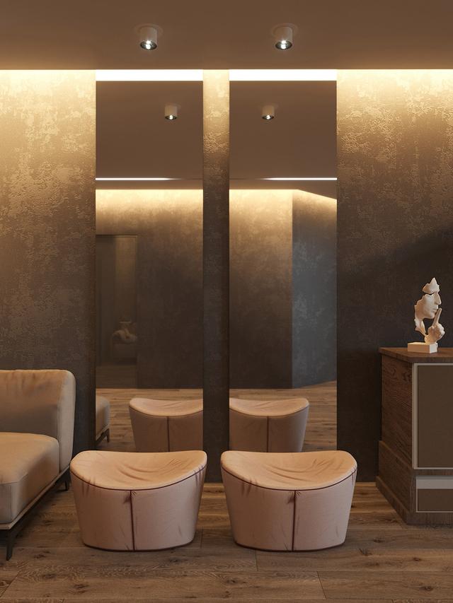 由數(shù)百個(gè)壁龕組成的網(wǎng)格構(gòu)成了電視墻的裝飾和餐廳旁邊的特色墻。意境照明創(chuàng)造有趣的光和陰影在安裝。