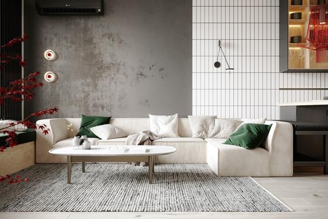 綠色的靠墊為這個(gè)灰色的客廳增添了一些意想不到的色彩。