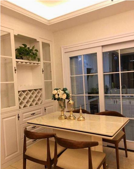 這是室內的餐廳,餐廳的顏值還是蠻高的,無論是頂面的回形吊頂設計還是墻面的嵌入式“酒柜”都很漂亮,尤其是酒柜的開放式酒格,擺放藏酒后裝飾效果特別好看上去大氣又很有檔次,唯一麻煩點的就是開放式酒柜容易積灰,清潔起來稍微麻煩點,也算是優劣參半吧!與餐廳一墻之隔的廚房中規中舉,L型櫥柜設計搭配吊柜,儲物方便看著也整潔。