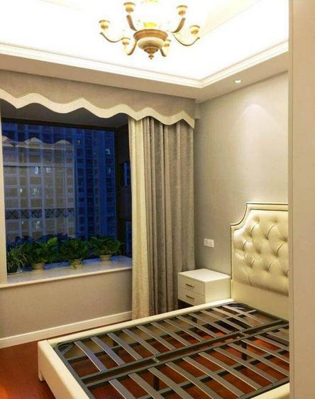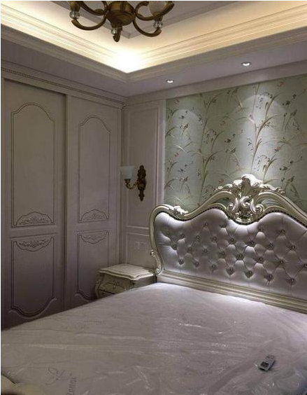 這是室內的主臥,主臥既是室內的儲物區也是休息區。所以裝修上主臥內部空間整體分為兩部分,休息區擺放了一張寬敞大氣的歐式風格雙人床,床頭的軟包造型精美,在燈光的映襯下頗有時尚感。墻面的墻畫和石膏板的組合也讓人眼前一亮,裝飾效果蠻不錯的。儲物區設計就相對簡單了很多,一排到頂的嵌入式大衣柜,造型簡約但樸實耐看,收納空間也蠻多的,贊一個。